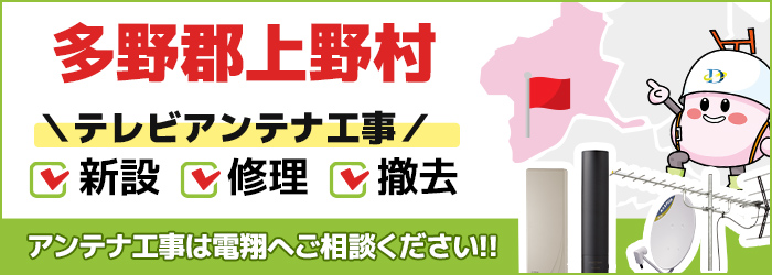 - 群馬県多野郡上野村のテレビアンテナ工事は、専門業者の株式会社電翔へお任せください。施工実績豊富な電翔が、群馬県多野郡上野村エリアの立地やご物件の特徴に合わせた施工をご提案いたします。新設はもちろん、修理や不具合系のご相談も歓迎です。まずはお気軽に無料見積もり相談をどうぞ。