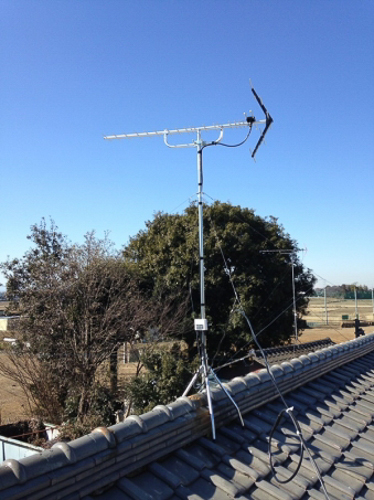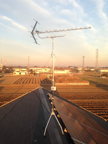 - 「太陽光発電があるとアンテナをつけれないのでは」と思う方も多いのではないでしょうか。アンテナの屋根上設置に使うスペースは、土台を置く約40cm幅で十分です。アンテナも倒れてこないように支線を張ってきちんと支えてあります。