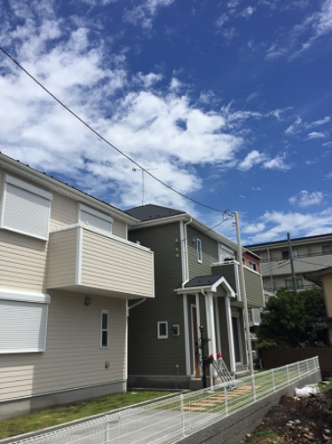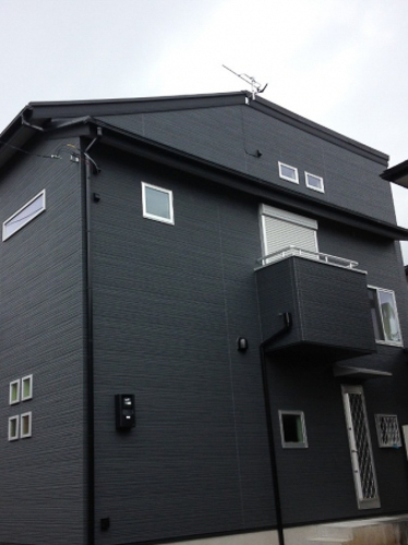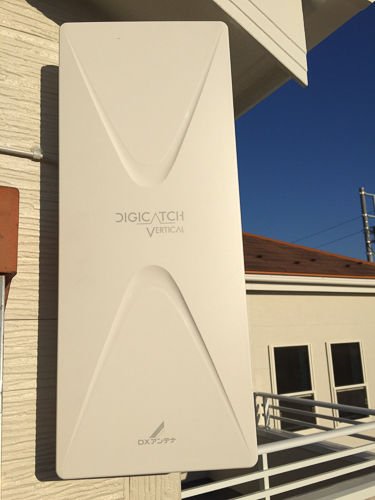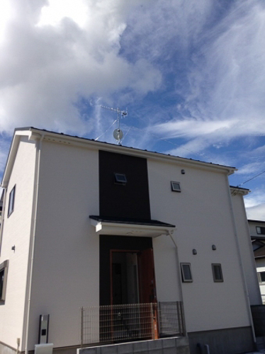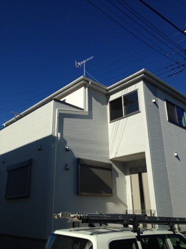 • ダークカラーの外壁に、窓枠や玄関柱などのホワイトの差し色が素敵な新築物件でした。テレビアンテナは、骨型のUHFアンテナを屋根上に設置。電翔では、通常工事では20素子相当のアンテナを使用しています。各部屋でテレビを見る場合は、増幅器の設置もおすすめしています。