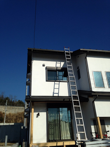 • 屋根上設置の場合は、写真のような長梯子をかけて作業を行います。この種類の地デジアンテナの設置なら作業時間は1時間半~2時間ほど。電翔は、アンテナ工事士の有資格者が多数在籍。技術力確かなスタッフがお伺いいたします。