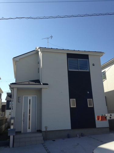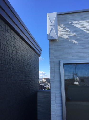 • 白の外観が清潔感のある雰囲気を感じる新築住宅。レンガ色の屋根材も暖かみがあり、大変オシャレです。この素敵な外観イメージに合うように、ホワイト色の地デジ用デザインアンテナを選んで、2階外壁に取り付けました。同系色のため、よく馴染んでいます。