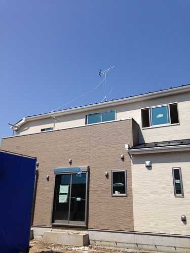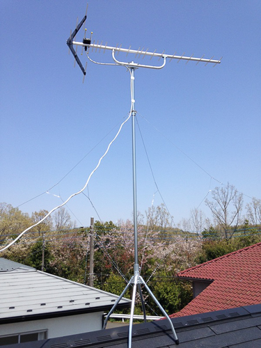 • 地上デジタル放送の視聴を目的としたアンテナ施工例です。戸建住宅の屋根上にUHFアンテナを設置してテレビ視聴を実現。アンテナは正確な電波調査のもと、正しい方角に位置調整しています。