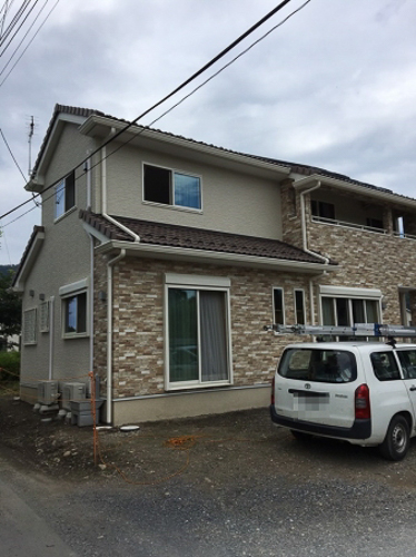 - クリーム系カラーにレンガ調の外壁を組み合わせたオシャレな造りの新築住宅。破風板にUHFアンテナを設置して、地デジ放送の視聴環境を整えました。金具はサイドベースを使用しており、立ち上げスタイルで屋根よりも高い位置で、感度が良い地デジ電波を受信できました。