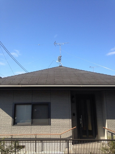 - 平屋住宅のアンテナ設置例です。地デジと衛星放送視聴を目的に、屋根上にUHFアンテナとBS/CSアンテナを使用しました。低い平屋でも、屋根上のような高い場所にアンテナを設置することで、テレビ電波が周辺の建物に遮られず、受信することができる場合があります。