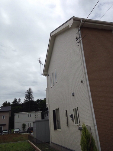 - 一建設様の新築物件に地デジの八木式アンテナタイプを取り付けました。設置場所は屋根の破風板部分。サイドベース金具をビス打ちし、固定しています。ビス穴には腐食防止と補強目的でコーキング処理を行っています。