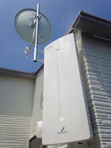 • 地デジと衛星放送の視聴環境を整えるためのアンテナ施工例。それぞれデザインアンテナとBS/CSアンテナを使用しました。これまで地デジのみをご視聴されていたお客様も衛星放送を追加することで、新しいテレビの楽しみ方がきっと見つかります。